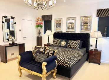 - Sleep: A massive King-size bed with luxury linens, set within a glamorous black-and-gold interior featuring fashion-inspired artwork and plush velvet furniture.