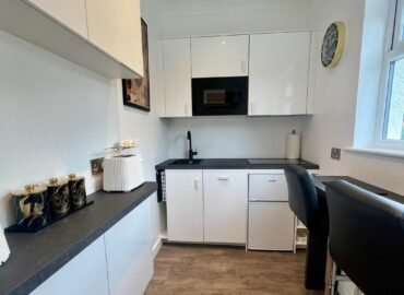 - Eat & Work: A fully equipped, comfortable kitchenette featuring modern white cabinetry and a breakfast bar perfect for morning coffee or laptop work.
